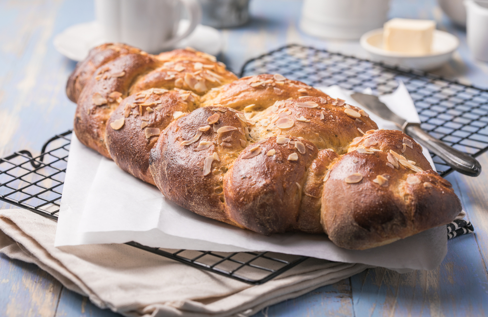 4. Στη συνέχεια, τη μοιράζετε σε τρία ίσα μέρη. Δημιουργείτε με το κάθε κομμάτι ζύμης ένα σκοινί περίπου ένα μέτρο μακρύ. Τα ενώνετε όλα στην άκρη μεταξύ τους και πλέκετε μια πλεξούδα. Τα ενώνετε να γίνουν ένα στεφάνι.