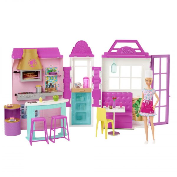 Περιλαμβάνει κούκλα Barbie® (29,21cm) που φοράει ρούχα και αξεσουάρ, 1 σετ εστιατόριο, 2 πιάτα, 1 μπολ με σαλάτα, 2 πίτσες με αλλαγή χρώματος, 3 επιδόρπια, 1 πιάτο ζυμαρικών, 2 φλιτζάνια, 2 πιρούνια, 2 μαχαίρια, 1 λουλούδι, 1 βάζο λουλουδιών, 1 ταμειακή μηχανή, 2 μενού, 1 μηχανή λεμονάδας, 2 σκαμπό, 1 καρέκλα, 1 τραπέζι, 1 μπαρ, 1 φωτιστικό, 1 φορητό δοχείο, 1 γλάστρα, ζυμαρικά και 1 σκεύος πίτσας.