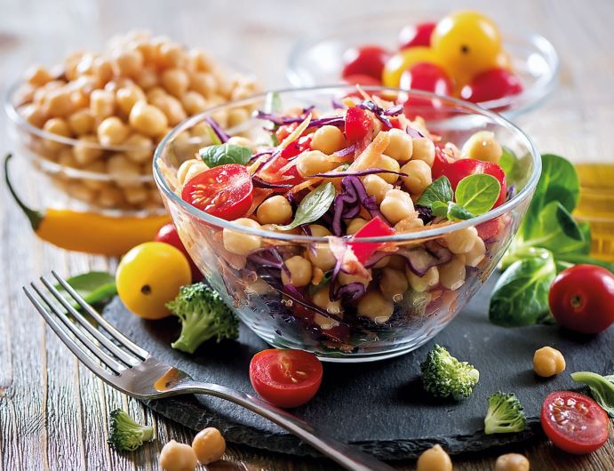 4. Στη συνέχεια χτυπάτε τα υλικά του ντρέσινγκ στο μούλτι μέχρι να ομογενοποιηθούν και περιχύνετε τα ρεβίθια και τα λαχανικά. Ανακατεύετε απαλά να πάει παντού η σος, γαρνίρετε με φύλλα βασιλικού και σερβίρετε.
