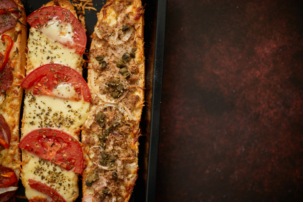 Ζεσταίνετε το φούρνο στους 180°C. Κόψτε στη μέση τις 2 μπαγκέτες κατά μήκος και τις ψήνετε απευθείας για 8 λεπτά. Εν τω μεταξύ, ανακατέψτε τις πιπεριές σε κύβους, το γλυκό καλαμπόκι, τον τόνο και 75 γρ. από το τριμμένο τσένταρ.
