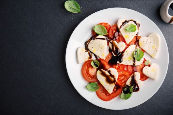 Κόψτε την μοτσαρέλα και τη ντομάτα σε ροδέλες και τοποθετήστε τις εναλλάξ τη μία επάνω στην άλλη στο πλάι. Περιχύστε την κρέμα και γαρνίρετε με τα φυλλαράκια του βασιλικού.