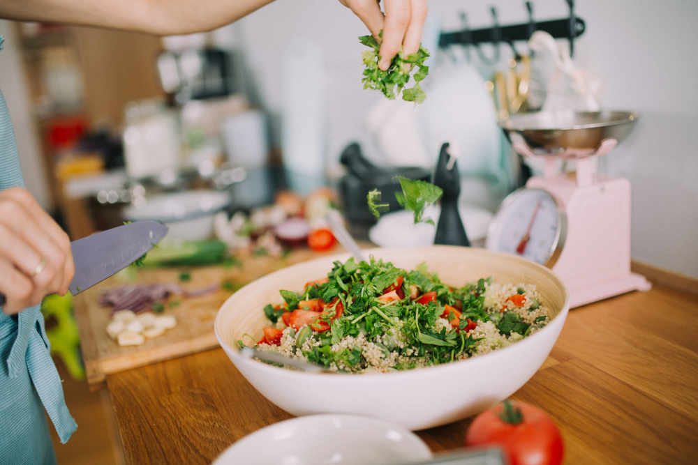 Κόψτε τα ντοματίνια στα τέσσερα και ψιλοκόψτε τον μαϊντανό. Ρίξτε τον μαϊντανό επάνω στη ρόκα, απλώστε από πάνω το κους κους, έπειτα τα ντοματίνια και τη σκελίδα του σκόρδου. Χτυπήστε το ελαιόλαδο με το λεμόνι και περιχύστε τη σαλάτα με το μείγμα σας. Πριν σερβίρετε προσθέστε αλάτι και πιπέρι.