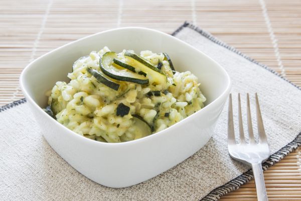 Ρίξτε μέσα τα κολοκυθάκια και συνεχίστε να προσθέτετε το ζωμό, ανακατεύοντας κάθε τόσο, μέχρι το ρύζι να γίνει κρεμώδες. Για να σερβίρετε, ανακατέψτε τα καρυκεύματα, το ξύσμα λεμονιού, το τυρί και την crème fraîche.