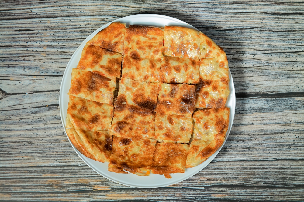 • Τέλος, χτυπάμε ένα αυγό με το γάλα και προσθέτουμε μια κουταλιά της σούπας βούτυρο, περιχύνουμε την πίτα και ψήνουμε στους 180°C Κελσίου Κελσίου για 45 περίπου λεπτά.