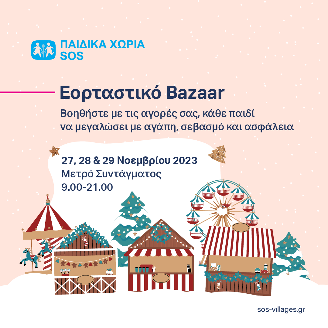 Τα Παιδικά Χωριά SOS μας καλούν να στηρίξουμε το πολύτιμο έργο τους και να γιορτάσουμε μαζί τα Χριστούγεννα, επιλέγοντας δώρα για τους αγαπημένους μας στο Εορταστικό 3ημερο Bazaar στο μετρό του Συντάγματος, βοηθώντας με τις αγορές μας, κάθε παιδί να μεγαλώσει με αγάπη σεβασμό και ασφάλεια.