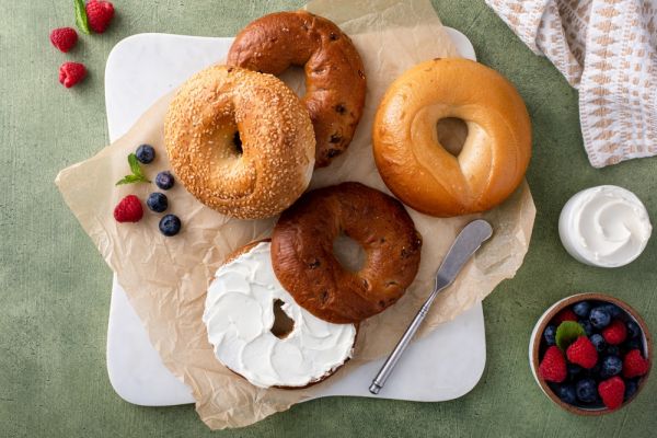 Αλείψτε τα bagels με το ασπράδι του αυγού και πασπαλίστε με σπόρους. Ψήστε για 20-25 λεπτά μέχρι να ροδίσουν.
