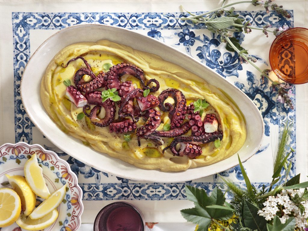 Ψήνουμε το χταπόδι για περίπου μία ώρα και 15 λεπτά έως 1½ ώρα στους 180ºC. Σερβίρουμε το χταπόδι με τη φάβα.