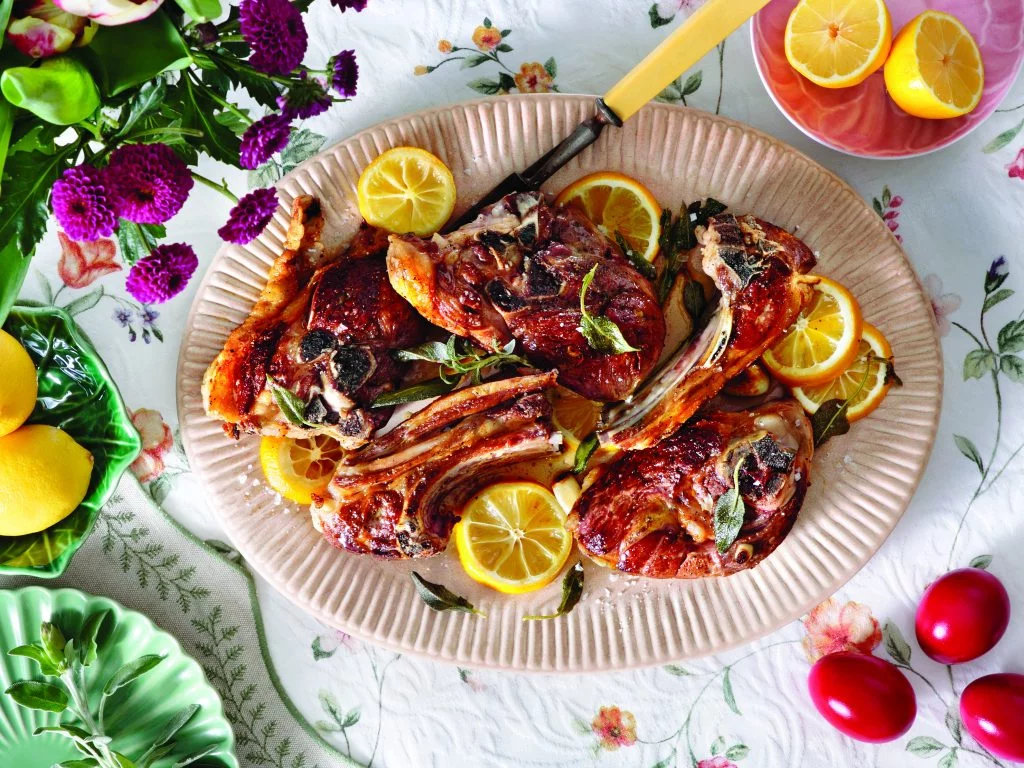 Ζεσταίνουμε σε ένα μεγάλο τηγάνι και σε μέτρια προς δυνατή φωτιά το μισό ελαιόλαδο και σοτάρουμε το κρέας να ροδίσει και από τις δύο πλευρές. Σβήνουμε με τη ρακή. Αν δεν χωρούν στο ίδιο τηγάνι ταυτόχρονα όλα τα κομμάτια του κρέατος, τα σοτάρουμε σε δόσεις, δίνοντας 1-2 λεπτά στο αλκοόλ να εξατμιστεί.