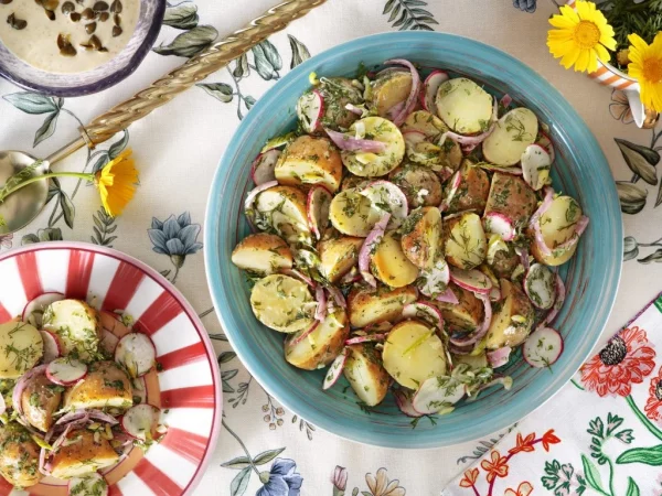 Περιχύνουμε με το μείγμα τις πατάτες όσο είναι ζεστές και ανακατεύουμε να το απορροφήσουν. Προσθέτουμε το φρέσκο κρεμμύδι, τον άνηθο, το μαϊντανό, τα ραπανάκια και το κρεμμύδι τουρσί, ανακατεύουμε και σερβίρουμε.