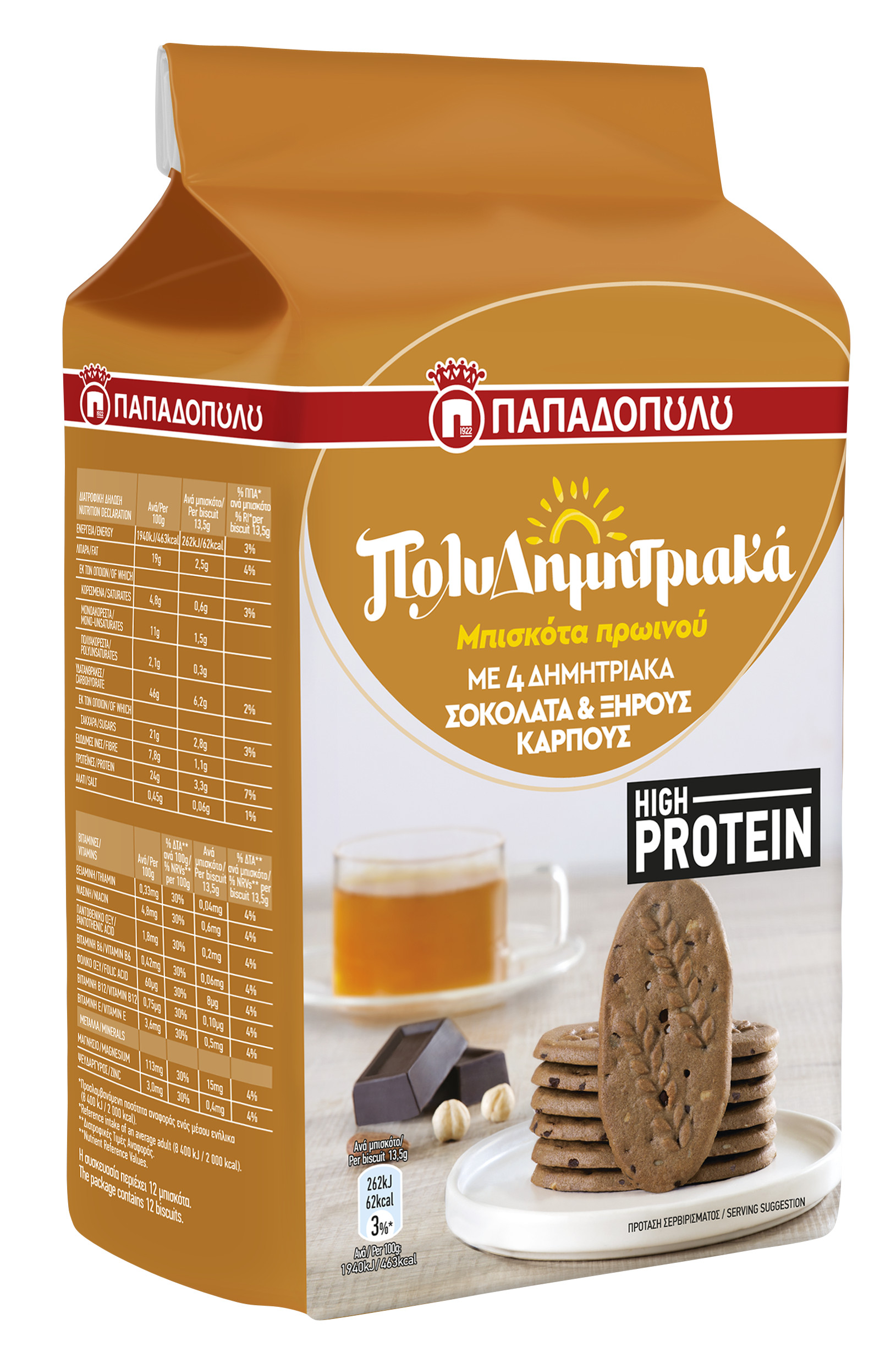 Τα νέα ΠολυΔημητριακά μπισκότα πρωινού High Protein, ξεχωρίζουν για την μοναδική γεύση σοκολάτας και ξηρών καρπών αλλά κυρίως για την υψηλή περιεκτικότητά τους σε πρωτεΐνη, που τα καθιστούν ιδανική επιλογή για όσους ζουν σε έντονους ρυθμούς, αλλά παράλληλα αναζητούν θρεπτικές λύσεις. Παράλληλα απευθύνεται σε όσους θέλουν να αυξήσουν την κατανάλωση πρωτεΐνης στην διατροφή τους, και να βοηθήσουν την αύξηση της μυϊκής μάζας του σώματος τους και την διατήρηση της καλής κατάστασης των οστών, στα πλαίσια μιας ποικίλης, ισορροπημένης διατροφής και άσκησης.