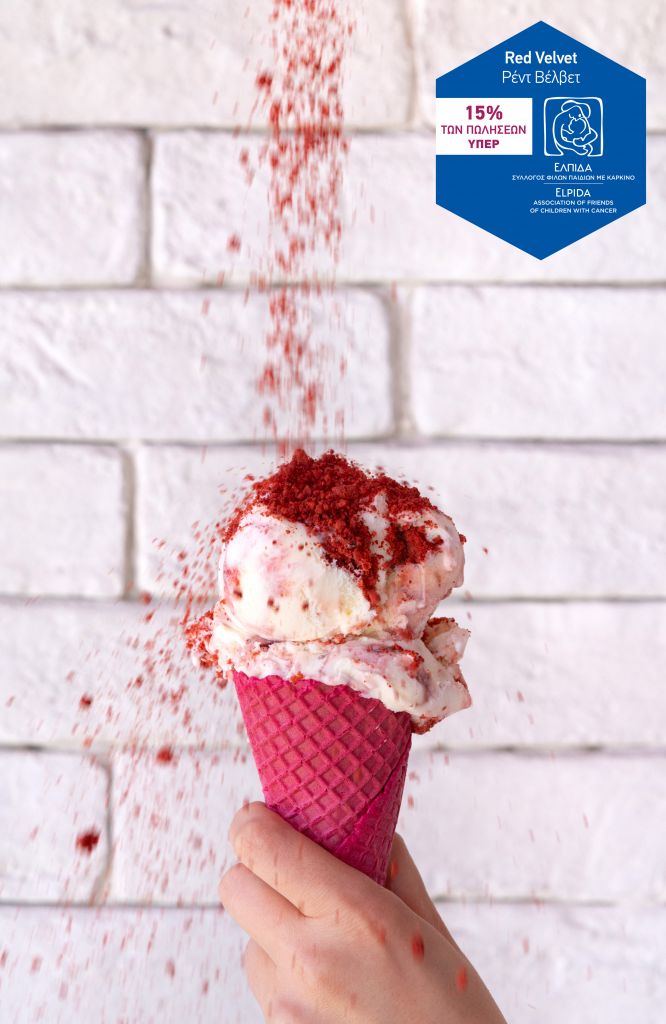 Πώς; Το 15% των κερδών από τις πωλήσεις του παγωτού red velvet θα διατεθεί στον Σύλλογο Ελπίδα!