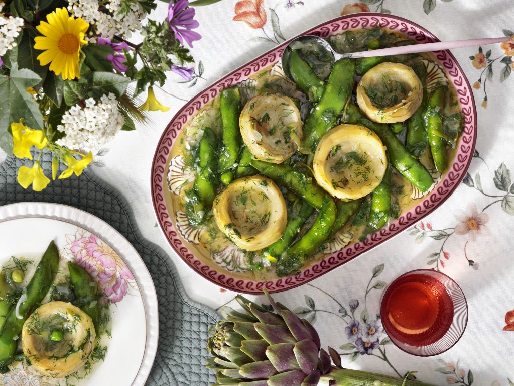Καθαρίζουμε τις αγκινάρες και τις ρίχνουμε σε ένα μπολ με 1 κ.σ. χοντρό αλάτι και 1 στυμμένο λεμόνι. Καθαρίζουμε τα κουκιά από τις ίνες και τα ζεματίζουμε σε νερό που βράζει για 5 λεπτά. Τα στραγγίζουμε.