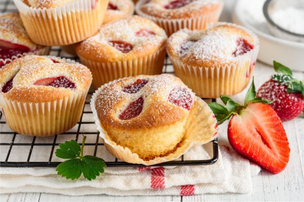 Μοιράστε το μείγμα στις θήκες για μάφιν. Βάλτε από πάνω μερικά κομμάτια από τις υπόλοιπες φράουλες μαζί με τις νιφάδες αμυγδάλου. Ψήστε στο κέντρο του φούρνου για 25 λεπτά μέχρι να φουσκώσουν και να πάρουν χρώμα.
