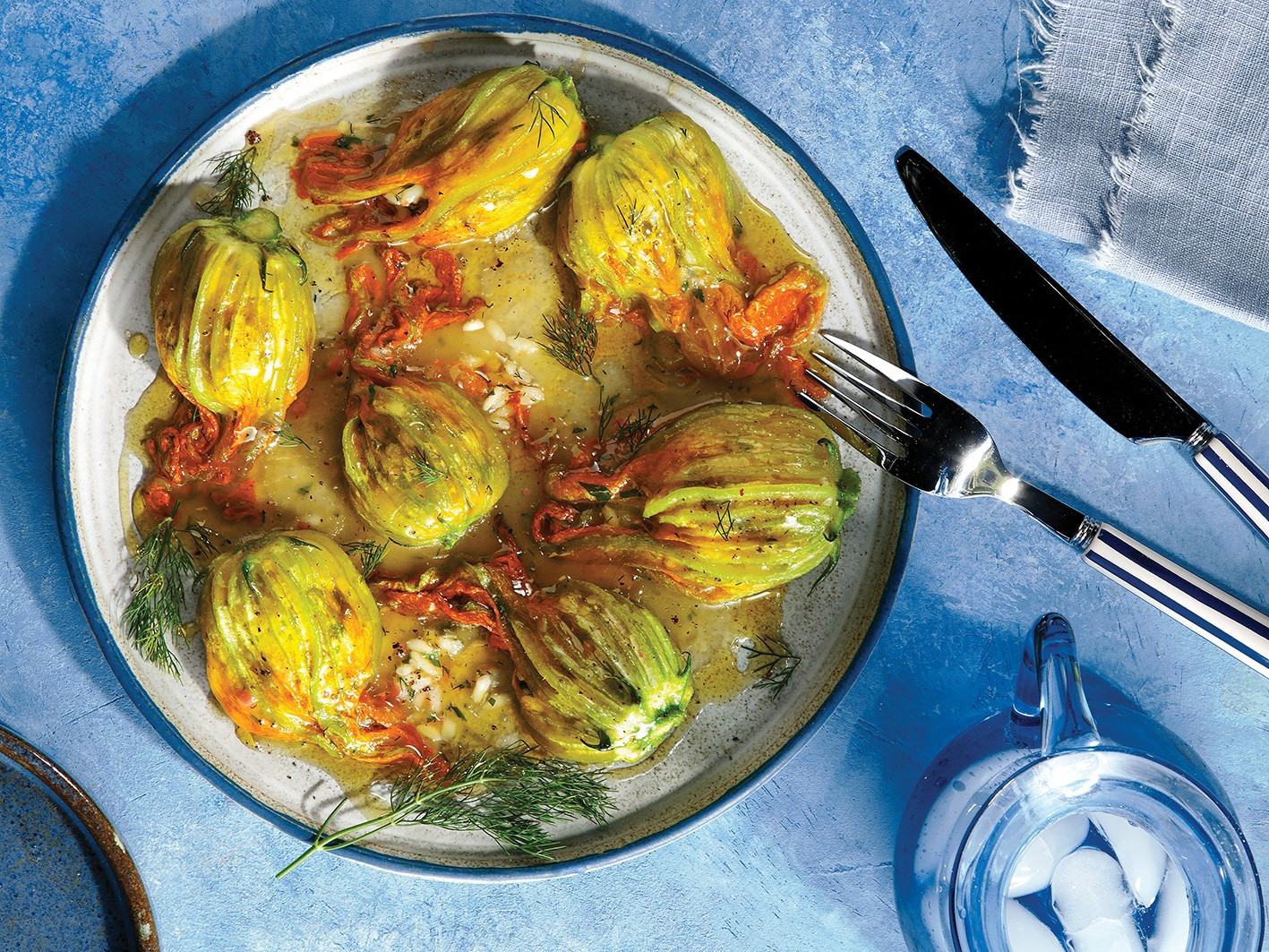 Γεμίζουμε, προσεκτικά για να μη σπάσουν, τους ανθούς και κλείνουμε τις άκρες, εγκλωβίζοντας τη γέμιση. Τους αραδιάζουμε σε μια κατσαρόλα, στριμωχτά τον ένα δίπλα στον άλλο, όπως τα ντολμαδάκια, με προσοχή να μην ανοίξουν. Συμπληρώνουμε νερό ώστε να σκεπαστούν μέχρι τη μέση. Αλατοπιπερώνουμε και περιχύνουμε με το υπόλοιπο ελαιόλαδο.