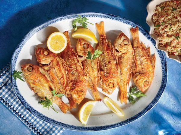 Αλευρώνουμε τα φρέσκα ψάρια, τα τινάζουμε να φύγει η περιττή ποσότητα αλευριού και τα τηγανίζουμε σε καυτό ελαιόλαδο.