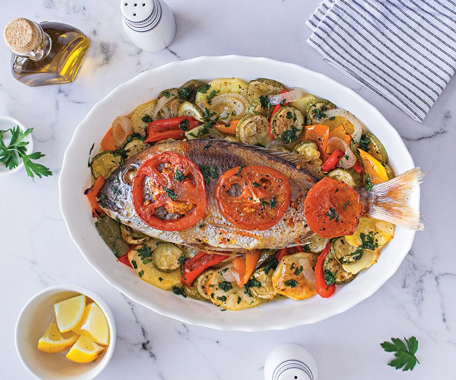 - Λαδώνουμε εξωτερικά το φαγκρί και το ακουμπάμε πάνω στα μισοψημένα λαχανικά. Τοποθετούμε λεπτές φέτες ντομάτας στην επιφάνεια του ψαριού, το περιχύνουμε με τα υγρά του ταψιού και συνεχίζουμε το ψήσιμο για 25 λεπτά ακόμα. Αφήνουμε το φαγητό να σταθεί για 10 λεπτά εκτός φούρνου για να πιει τα υγρά του και σερβίρουμε.