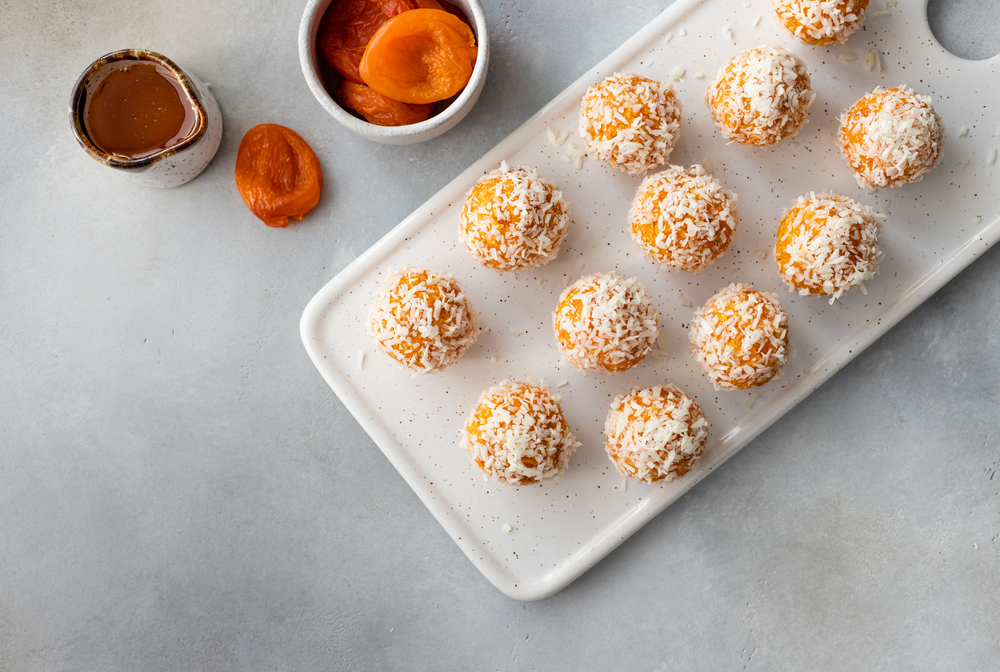 • Ξεκινήστε να παίρνετε μικρές ποσότητες από το μείγμα και να πλάθετε μικρές μπαλίτσες (υπολογίστε μια κουταλιά της σούπας για την καθεμία). Αν επιθυμείτε κυλήστε τις μπαλίτσες πάνω από τριμμένη καρύδα, την οποία έχετε απλώσει σε ένα πιάτο. Τοποθετήστε τις ενεργειακές μπαλίτσες από βερίκοκο σε αεροστεγές δοχείο και καταναλώστε τες μέσα σε μία εβδομάδα. Αν έχει πολύ ζέστη, μπορείτε να τις διατηρήσετε στο ψυγείο.