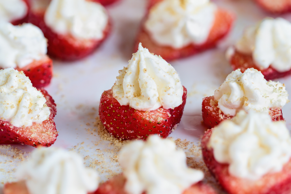 Γεμίστε κάθε φράουλα με το μείγμα χρησιμοποιώντας ένα κουτάλι. Βουτήξτε την κρεμώδη κορυφή της κάθε φράουλας στο τριμμένο μπισκότο. Φυλάξτε τις φράουλες στο ψυγείο μέχρι να τις σερβίρετε.