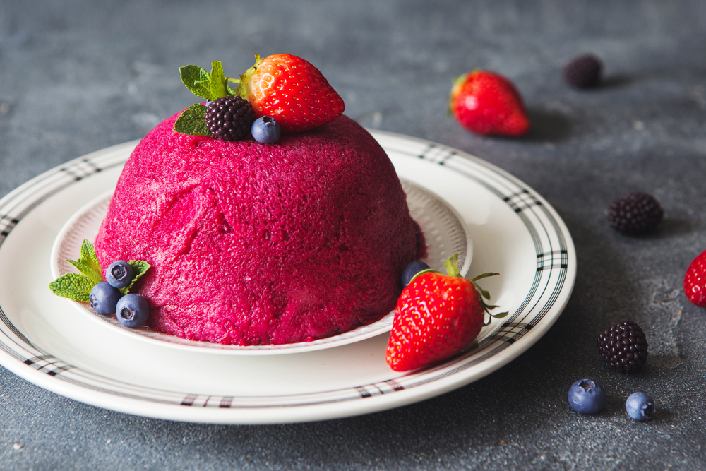 • Παγώστε για 6 ώρες ή όλη τη νύχτα. Για να σερβίρετε, ανοίξτε τη μεμβράνη και στη συνέχεια βάλτε ένα πιάτο σερβιρίσματος ανάποδα στην κορυφή και αναποδογυρίστε το. Βάλτε λίγα φρούτα για γαρνίρισμα.