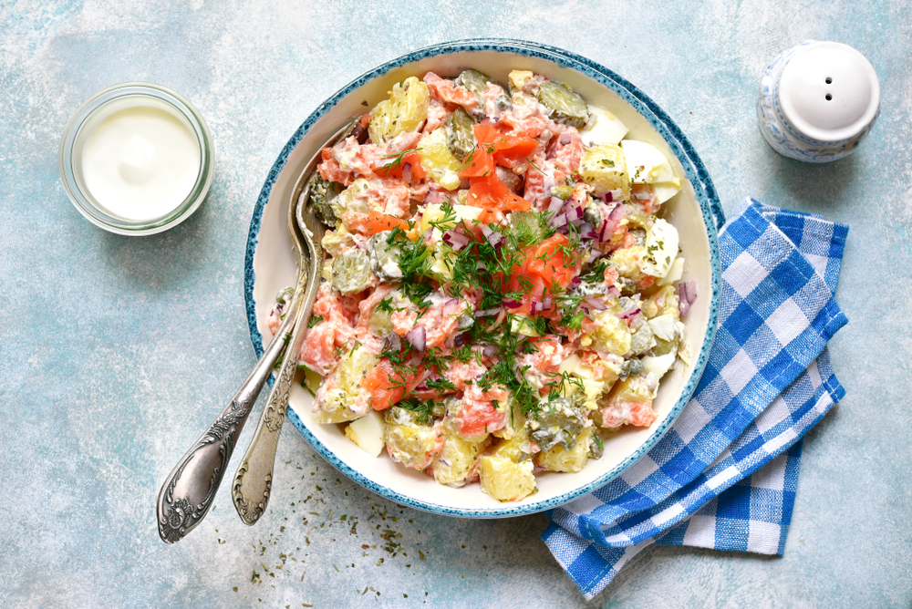Πασπαλίστε τη πατατοσαλάτα με ψιλοκομμένο σχοινόπρασο, για γαρνίρισμα και σερβίρετε.