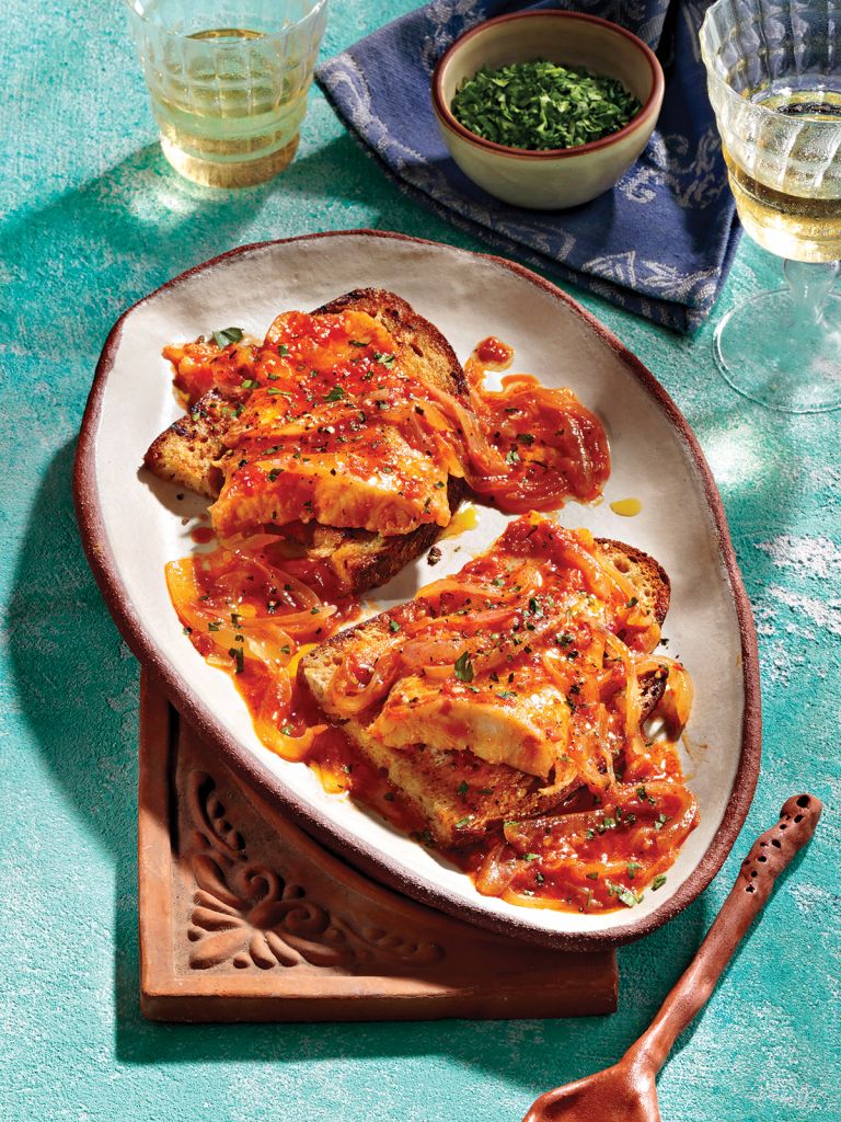 - Παράλληλα, φρυγανίζουμε τις φέτες ψωμιού. Τις τρίβουμε με το σκόρδο και τις ραντίζουμε με ελαιόλαδο. Τοποθετούμε σε κάθε πιάτο μία φέτα σκορδόψωμο, ακουμπάμε από πάνω το ψάρι και περιχύνουμε με το σούγο. Ραντίζουμε με λίγο ελαιόλαδο και πασπαλίζουμε με λίγο ψιλοκομμένο μαϊντανό.