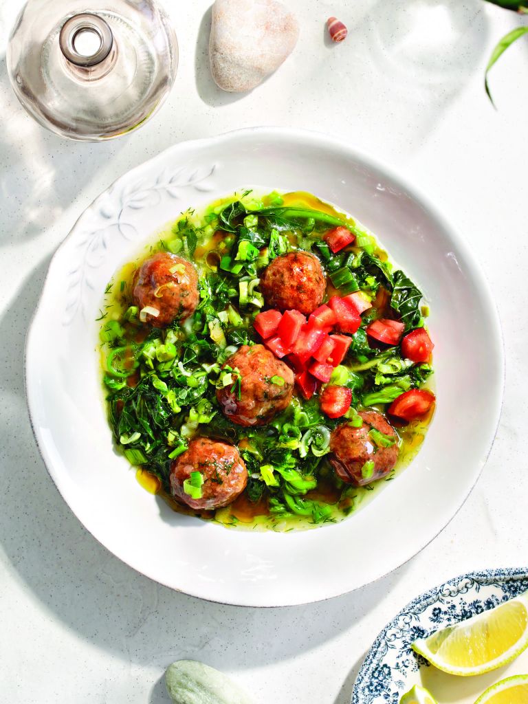 - Μόλις εξατμιστεί το αλκοόλ, προσθέτετε τα κεφτεδάκια και ελάχιστο ζεστό νερό και τα αφήνετε να μαγειρευτούν με τα χόρτα για 10 λεπτά σε χαμηλή φωτιά. Ελέγχετε και διορθώνετε το αλάτι και το πιπέρι, προσθέτετε τον άνηθο και το μάραθο και χαμηλώνετε τη φωτιά στο ελάχιστο, να κοπεί ο βρασμός.