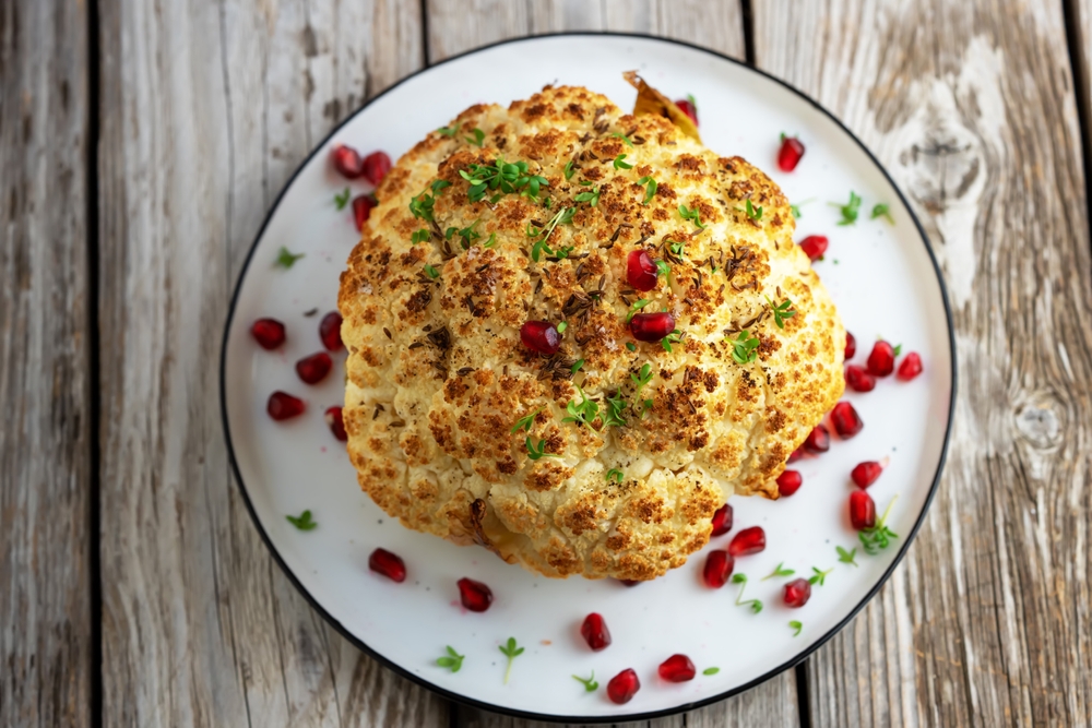 • Με το πίσω μέρος ενός κουταλιού, απλώστε ομοιόμορφα το μείγμα της φέτας σε μια πιατέλα. Ρίξτε από πάνω το ψημένο κεφάλι κουνουπιδιού και πασπαλίστε με ρόδι. Γαρνίρετε με επιπλέον δυόσμο ή/και φέτες λεμονιού, αν θέλετε.