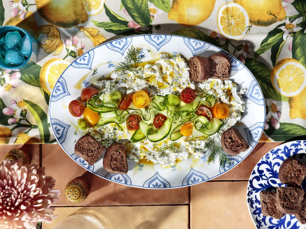 - Κόβουμε τα ντοματίνια στη μέση και το αγγούρι σε καρέ. Τα ραντίζουμε με λίγο ελαιόλαδο. Σερβίρουμε την αλοιφή φέτας απλωμένη σε πιάτο με τα λαχανικά στη μέση.