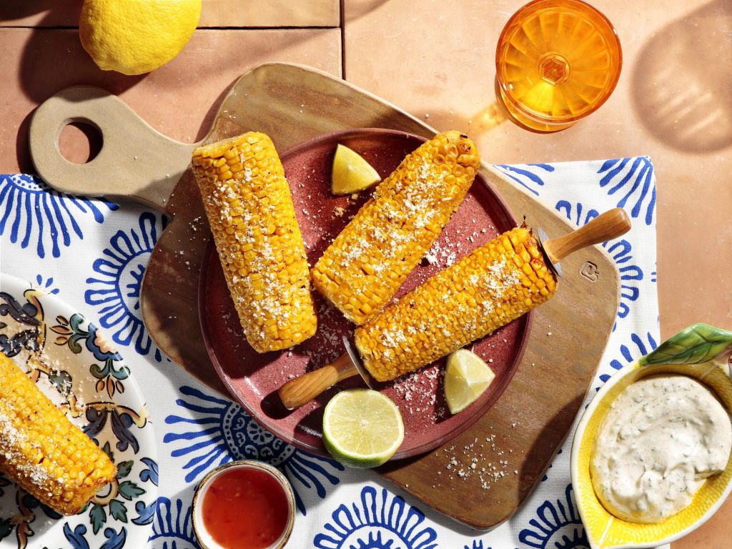 - Σερβίρουμε τα καλαμπόκια με παρμεζάνα, καυτερή σάλτσα, φέτες λάιμ και ψιλοκομμένο κόλιανδρο.