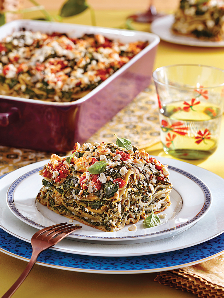 - Προσθέτουμε τις ντομάτες και πασπαλίζουμε με τα τρίμματα φέτας. Ραντίζουμε την επιφάνεια με ελάχιστο ελαιόλαδο και ψήνουμε σε προθερμασμένο φούρνο, στους 180°C, για 40 λεπτά. Αφήνουμε τα λαζάνια να σταθούν για 10 λεπτά εκτός φούρνου πριν τα κόψουμε σε κομμάτια και τα σερβίρουμε όσο είναι ζεστά.