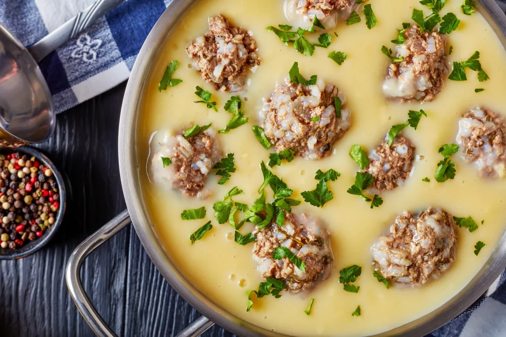 - Χαμηλώνουμε κι άλλο τη φωτιά, να καταλαγιάσει ο βρασμός, και με μια μεγάλη κουτάλα παίρνουμε ζωμό από τα γιουβαρλάκια και τον προσθέτουμε σιγά σιγά στο αβγολέμονο, χτυπώντας πάντα το μείγμα. Ρίχνουμε κατά αυτό τον τρόπο δύο κουτάλες ζωμό ώστε να αραιώσουμε το μείγμα και να ανεβάσουμε σταδιακά τη θερμοκρασία του.