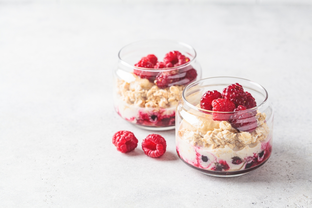 - Το επόμενο πρωί, μοιράστε το σε δύο μπολάκια και προσθέστε τα σμέουρα, τους υπόλοιπους σπόρους κάνναβης, τους σπόρους κολοκύθας και τη σοκολάτα.