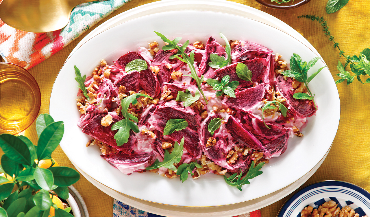 - Σερβίρουμε την παντζαροσαλάτα σε πιατέλα γαρνίροντας με λίγη τρυφερή ρόκα και φρέσκα φύλλα δυόσμου ή άνηθου. Λίγα καρύδια στην επιφάνεια ολοκληρώνουν ιδανικά το στήσιμο του πιάτου.