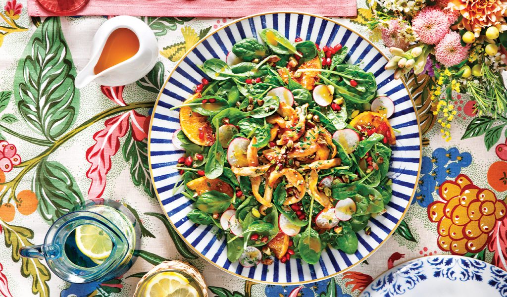 • Ανακατεύουμε καλά σε ένα μπολ το σπανάκι με το σουσάμι, τα ραπανάκια, τα μισά φιστίκια, το μισό ρόδι και περίπου τη μισή ποσότητα ντρέσινγκ. Σερβίρουμε σε ρηχή πιατέλα, χωρίς ζουμιά.