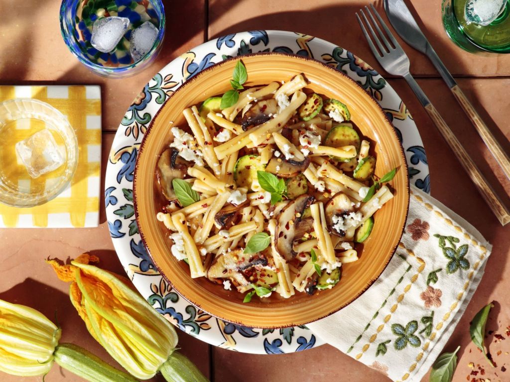 - Αποσύρουμε το σκεύος από την εστία και ενσωματώνουμε τη φέτα και το ξύσμα. Τέλος, προσθέτουμε τα λαχανικά, το βασιλικό, το υπόλοιπο ελαιόλαδο και φρεσκοτριμμένο πιπέρι, ανακατεύουμε απαλά και σερβίρουμε.