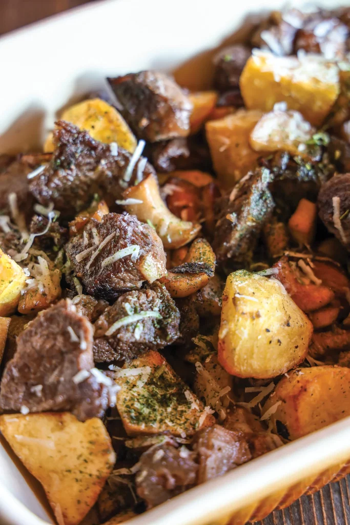 - Σβήνουμε το κρέας με το κρασί. Μόλις εξατμιστεί το αλκοόλ, ρίχνουμε τις ήδη τηγανισμένες και στραγγισμένες πατάτες. Ανακατεύουμε απαλά για να μπερδευτούν οι μυρωδιές και τα υλικά και γαρνίρουμε με παρμεζάνα, άγριο σκόρδο τριμμένο και ξύσμα λεμονιού.