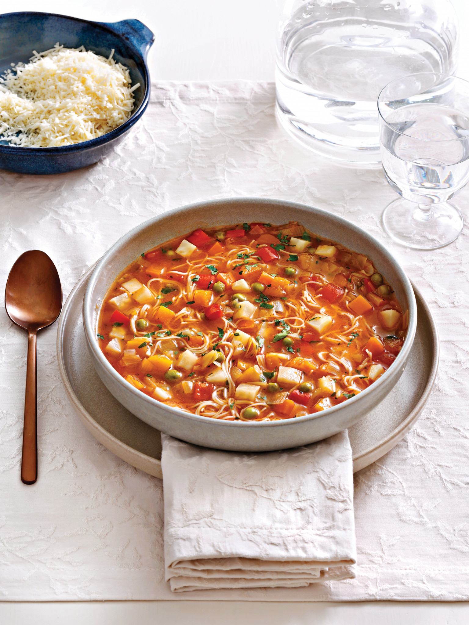 • Χαμηλώνουμε τη φωτιά και σιγοβράζουμε με κλειστό καπάκι για περίπου 30 λεπτά, μέχρι να μαλακώσουν τα λαχανικά. Κατόπιν, σπάμε το φιδέ, τον ρίχνουμε στη σούπα ανακατεύουμε και τα αφήνουμε στη φωτιά για 2 λεπτά ακόμα.