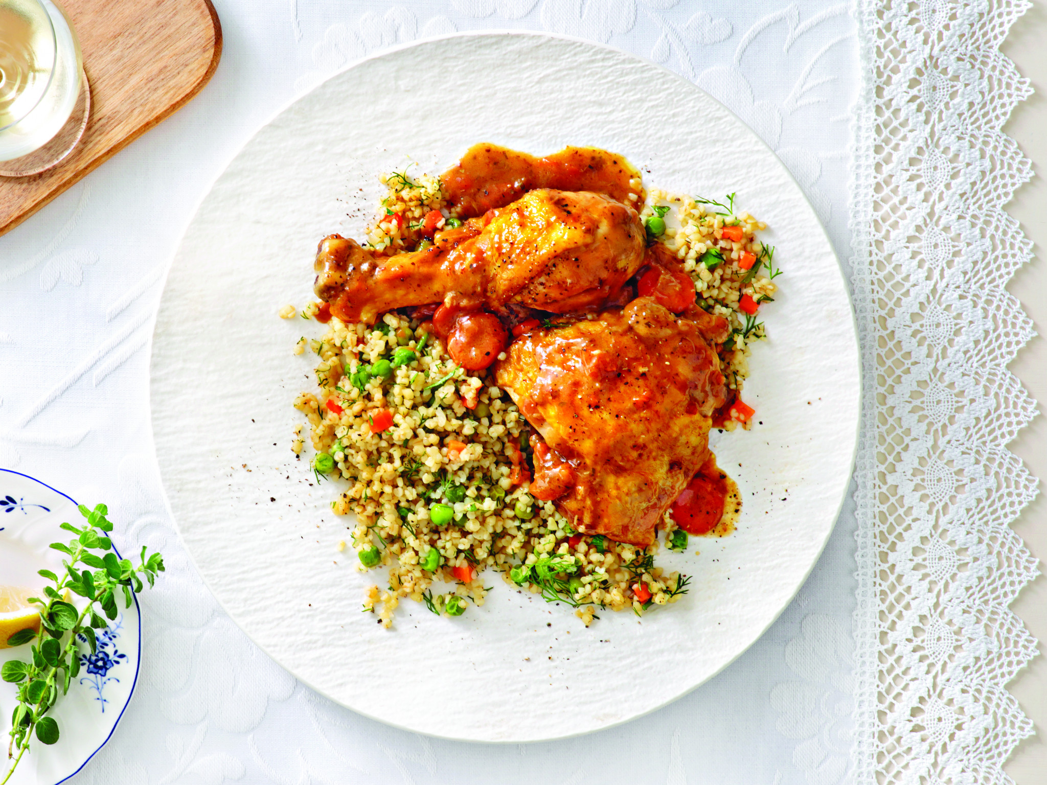 - Κλείνουμε το σκεύος με το καπάκι του και μαγειρεύουμε το κοτόπουλο σε μέτρια ένταση για περίπου 30 λεπτά, μέχρι να μαλακώσει. Ελέγχουμε το αλατοπίπερο στο τέλος του βρασμού και πασπαλίζουμε με τη ρίγανη. Όταν το κατεβάσουμε από τη φωτιά, το φαγητό πρέπει να έχει μένει με λίγη σάλτσα, σχεδόν με το λάδι του. Το σερβίρουμε με το πλιγούρι λαχανικών.