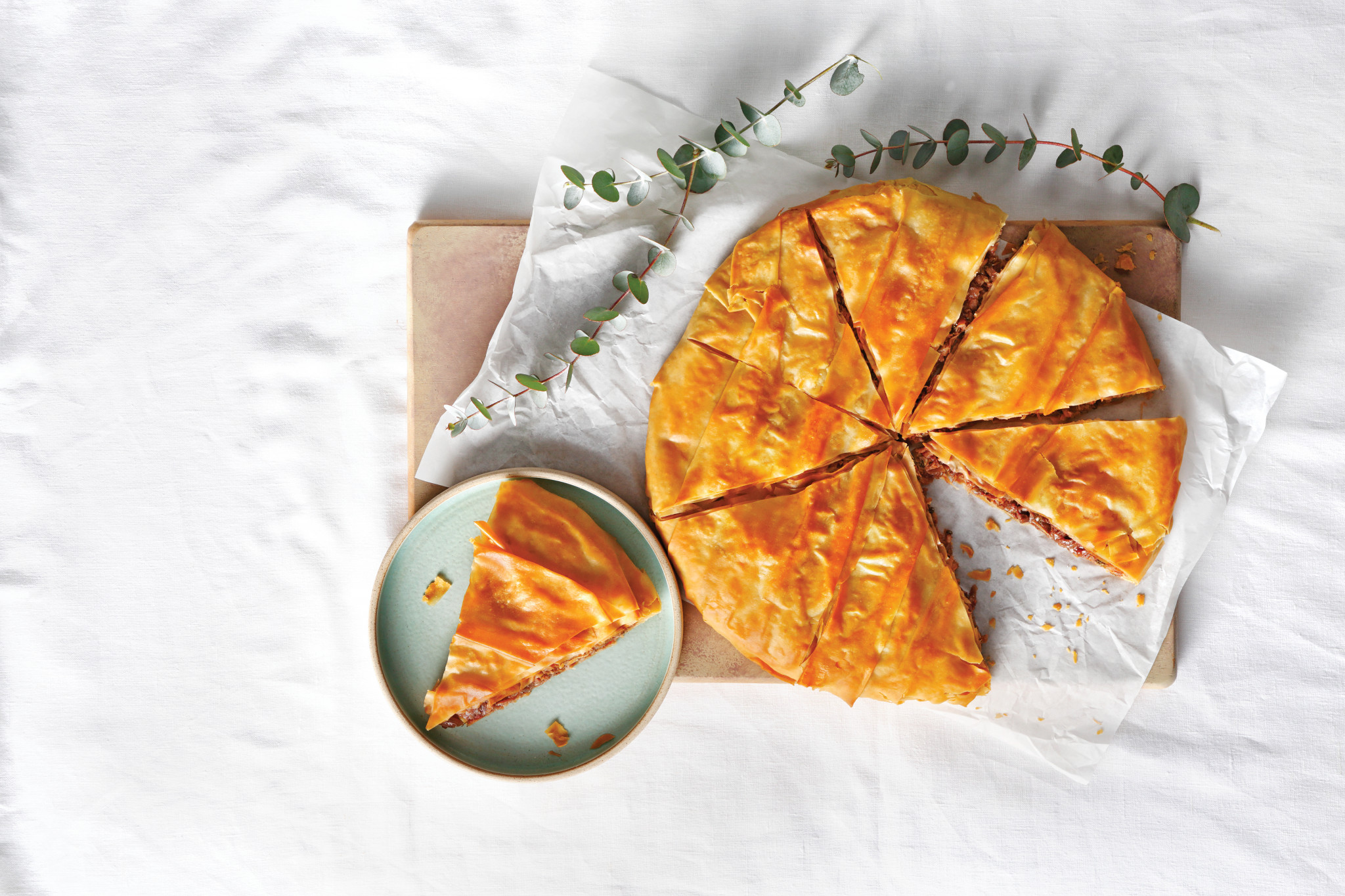 • Λαδώνουμε ένα ρηχό ταψί 36 εκ. και στρώνουμε ακτινωτά τα μισά φύλλα, ραντίζοντάς τα με ελαιόλαδο. Απλώνουμε τη γέμιση, γυρίζοντας πάνω της τις άκρες των φύλλων που περισσεύουν.
