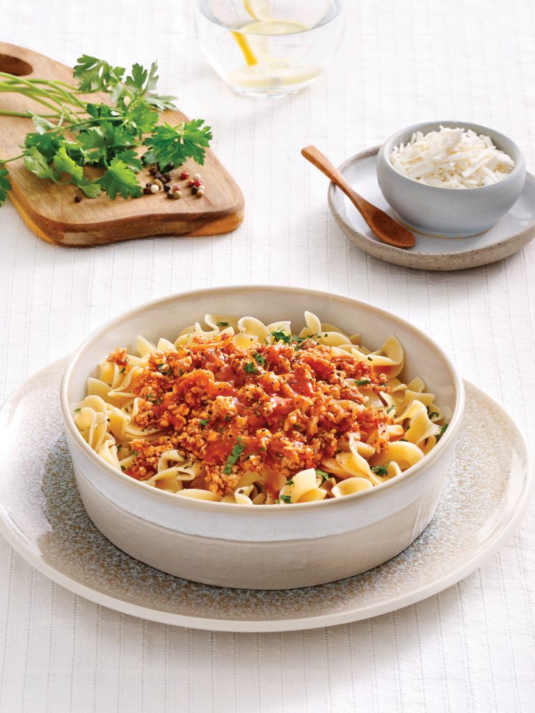 Στο μεταξύ βράζουμε τις χυλοπίτες σε άφθονο αλατισμένο νερό σύμφωνα με τις οδηγίες της συσκευασίας τους. Τις σουρώνουμε και τις επαναφέρουμε στην κατσαρόλα όπου τις ανακατεύουμε με το υπόλοιπο ελαιόλαδο. Αν θέλουμε, τις ανακατεύουμε με τον κιμά ή απλά τον σερβίρουμε από πάνω. Προσθέτουμε τριμμένο τυρί και φρεσκοτριμμένο πιπέρι.