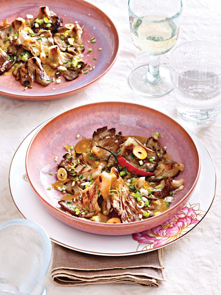 - Χτυπάμε τα υλικά του ντρέσινγκ μέχρι να ομογενοποιηθούν. Μόλις βγάλουμε τα μανιτάρια από το φούρνο, τα περιχύνουμε με το ντρέσινγκ. Τα πασπαλίζουμε με μαϊντανό, σχοινόπρασο και κρεμμυδάκι και σερβίρουμε.