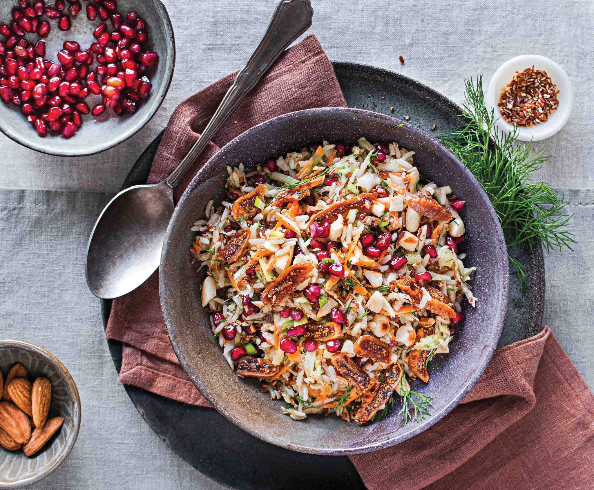 • Προσθέτουμε στα τριμμένα λαχανικά το ρόδι, τα σύκα, τα αμύγδαλα, το κρεμμυδάκι, το λιναρόσπορο, τον άνηθο και το ρύζι.
