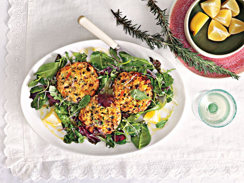 Πλάθουμε μπιφτέκια από το μείγμα και τα αραδιάζουμε σε ένα λαδωμένο ταψί.