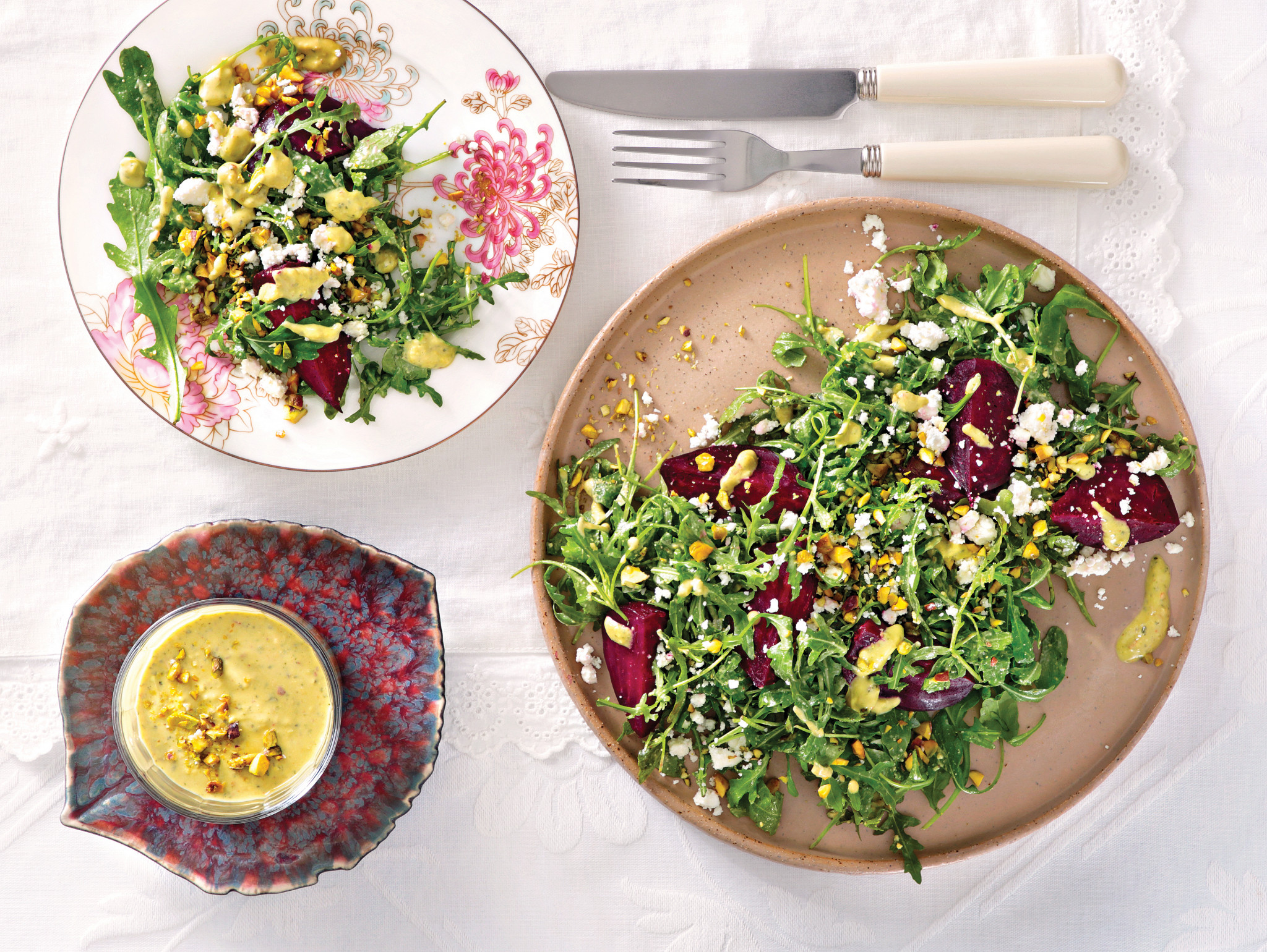 Πλένουμε και στεγνώνουμε καλά τη ρόκα. Τη χοντροκόβουμε και τη βάζουμε σε μπολ. Την ανακατεύουμε με 2-3 κ.σ. ντρέσινγκ και τη σερβίρουμε σε πιατέλα. Ανακατεύουμε τα παντζάρια με λίγο ντρέσινγκ και τα ακουμπάμε πάνω από τη ρόκα. Πασπαλίζουμε με τη φέτα κα σερβίρουμε.