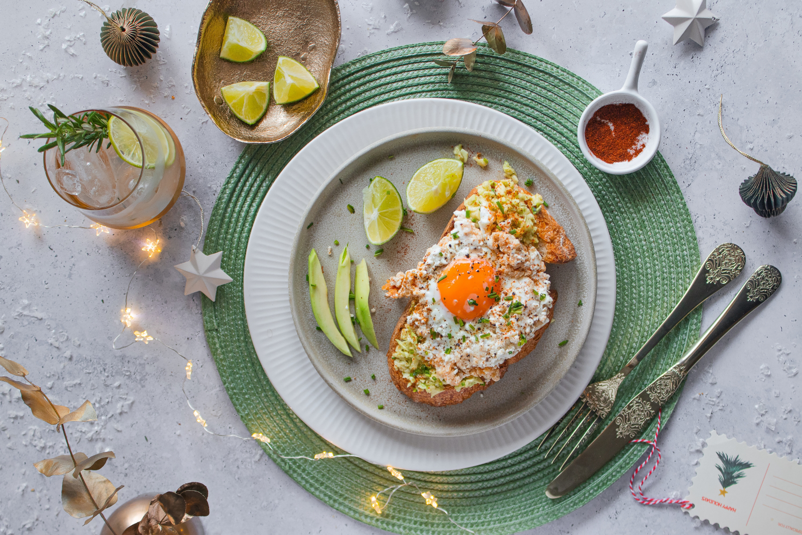 • Απλώνουμε σε κάθε φέτα ψωμιού μια στρώση αβοκάντο και ακουμπάμε το αβγό με την τραγανή φέτα.