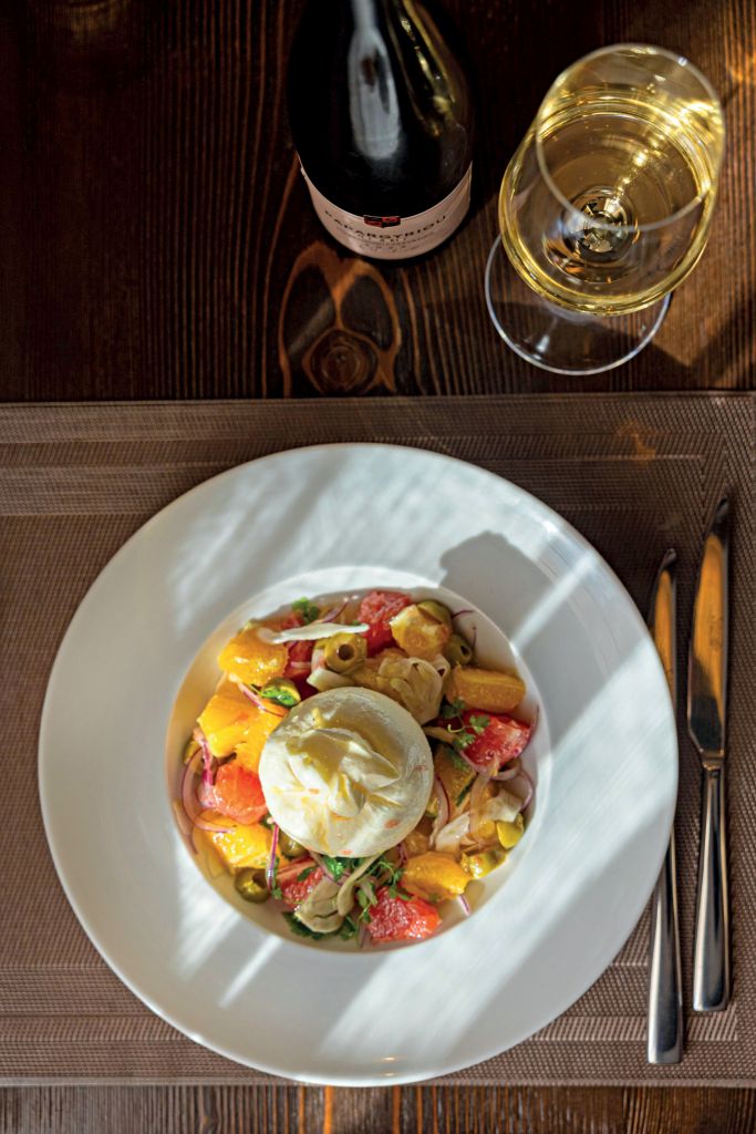 - Τοποθετούμε την μπουράτα στην κορυφή της σαλάτας και την περιχύνουμε με τους χυμούς της μπασίνας. Τελειώνουμε ραντίζοντας τη νερατζοσαλάτα με λίγο εξαιρετικό παρθένο ελαιόλαδο.