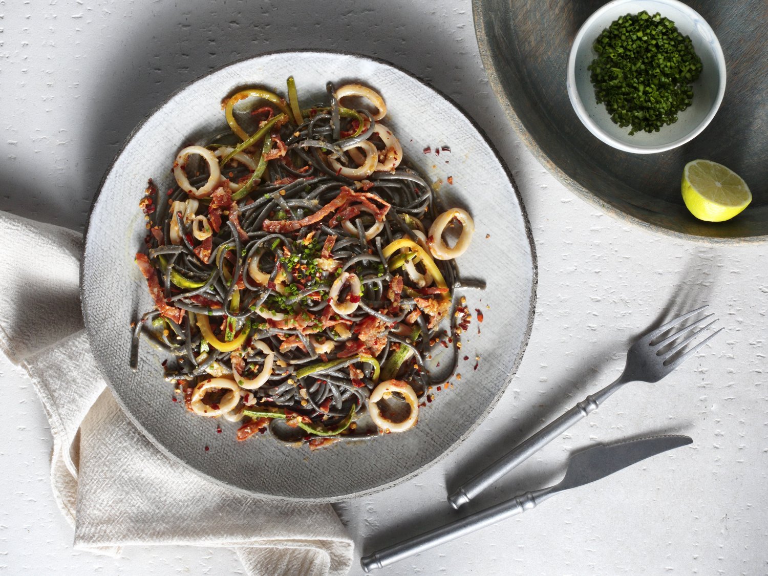 - Σερβίρουμε τα σπαγγέτι σε πιάτο και πασπαλίζουμε με ψιλοκομμένο σχοινόπρασο και λίγο ξύσμα λάιμ.