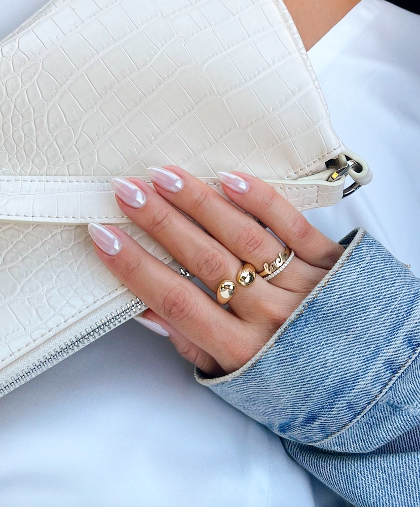 Εάν θέλετε ένα απλό, μίνιμαλ και κομψό μανικιούρ μετά τις καρδούλες και τα έντονα κόκκινα που κάνατε για τη γιορτή του Αγ. Βαλεντίνου, το συγκεκριμένο στιλ νυχιών είναι το ιδανικό για εσάς. Προτιμήστε μια γαλακτερή απόχρωση και προσθέστε από πάνω λίγη σκόνη chrome για ένα σούπερ λαμπερό φινίρισμα.