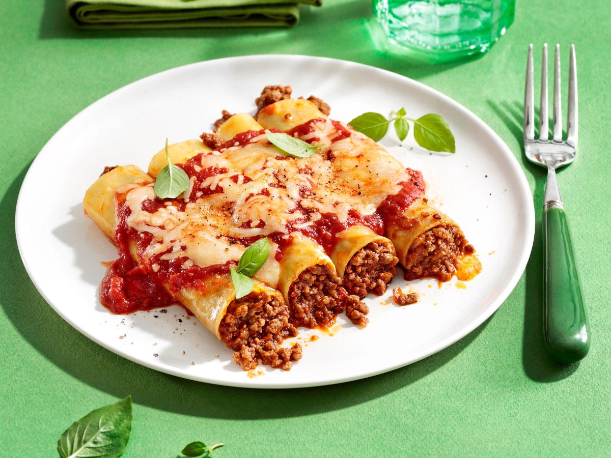 - Γεμίζουμε τα κανελόνια με το μείγμα του κιμά και τα αραδιάζουμε σε ένα πυρέξ. Τα περιχύνουμε με τη σάλτσα ντομάτας. Καλύπτουμε την επιφάνεια με τριμμένη κεφαλογραβιέρα.