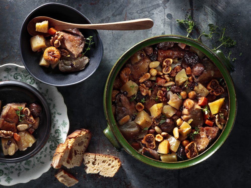 - Στο μεταξύ ετοιμάζουμε και τα υπόλοιπα υλικά. Όταν συμπληρωθεί το δίωρο, ξεσκεπάζουμε το φαγητό και ρίχνουμε τα αποξηραμένα φρούτα και τους ξηρούς καρπούς. Ελέγχουμε αν έχει στεγνώσει το φαγητό και, αν χρειάζεται, προσθέτουμε λίγο βραστό νερό.